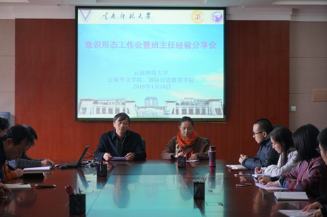 为认真贯彻落实学校意识形态工作会议要求,切实做好中外学生意识形态工作及学生管理工作,116日中午,华文学院在同析2号楼419会议室召开“意识形态工作暨班主任经验分享会”,校党委副书记李宏,华文学院党委书记和雪莲、副院长李天明、学院中外学生班主任及辅导员参加了会议,会议由学院党委副书记伏云辉主持。