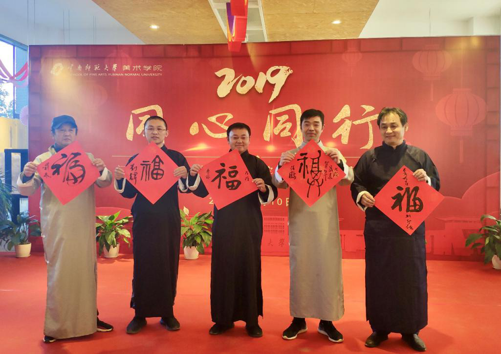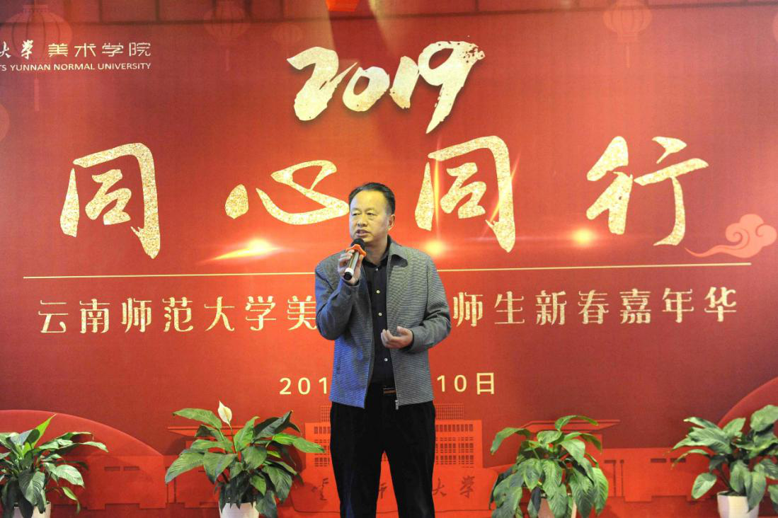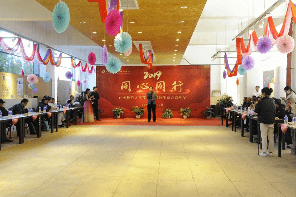 1月10日下午,我校美术学院众创中心暖意融融,充满中国年味的红灯笼和五颜六色的气球、拉花高高挂起,美术学院全体教师及学生代表100余人在这里欢聚一堂,参加“同心同行”——云南师范大学美术学院师生新春嘉年华活动,共同分享收获的喜悦,展望更美好的未来。欢声笑语中传递新春喜庆,祝福问候里共话未来发展。副校长安学斌出席活动并致辞。