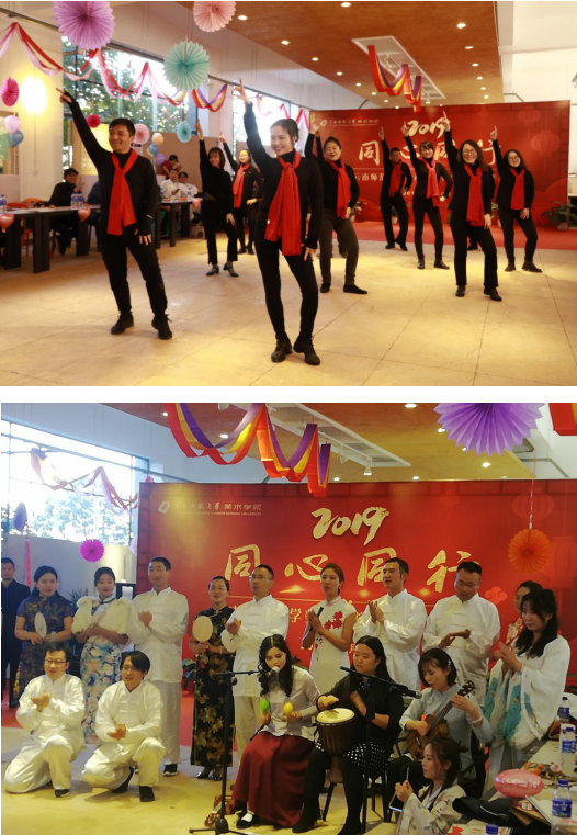 各组表演精彩文艺节目。书法系五人组合《迎春送福》,以不同字体创作福字,道出美院人共同的心愿。学院领导表演的《芳华》、设计系表演的《太极·太急》串烧,欢快的节奏、热情舞姿,展现了美院人凝心聚力、团结向上的精神风貌,赢得了阵阵掌声。美术系表演《鸿雁》、《我们是中国》和《催眠》,欢乐的音符、柔美的舞蹈表达出新春的喜悦,带来浓浓的中国年味。行政组用传统演绎当下的华彩,集快板、弹凑、太极表演、旗袍秀一体的组合秀《画堂春》在款款深情中展现奋发的活力。