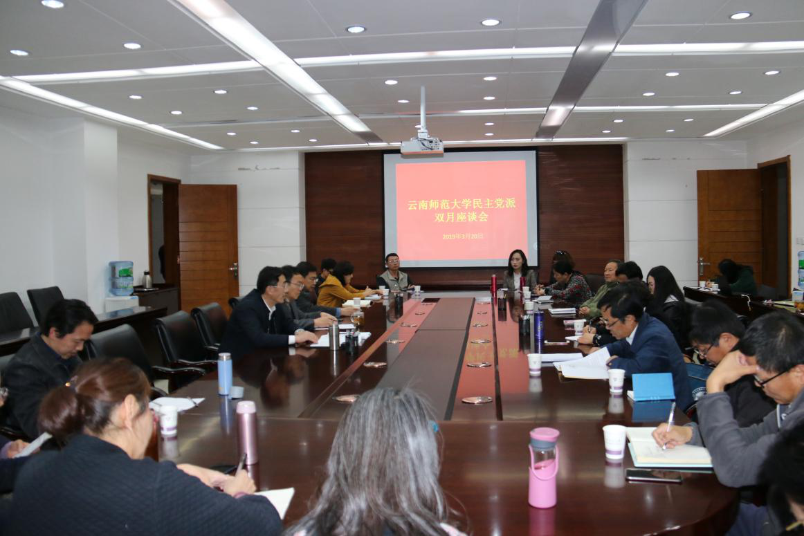 3月20日下午,学校2019年度第一次民主党派 “双月座谈会”在呈贡主校区行政楼211会议室召开,在校的各级人大代表、政协委员,省、市政府参事,省、市文史馆员,各民主党派基层组织负责人,党外知识分子联谊会、留学人员联谊会、侨联会、少数民族知识分子联谊会负责人和代表,统战部全体人员参加会议。会议由校党委副书记张玮主持。