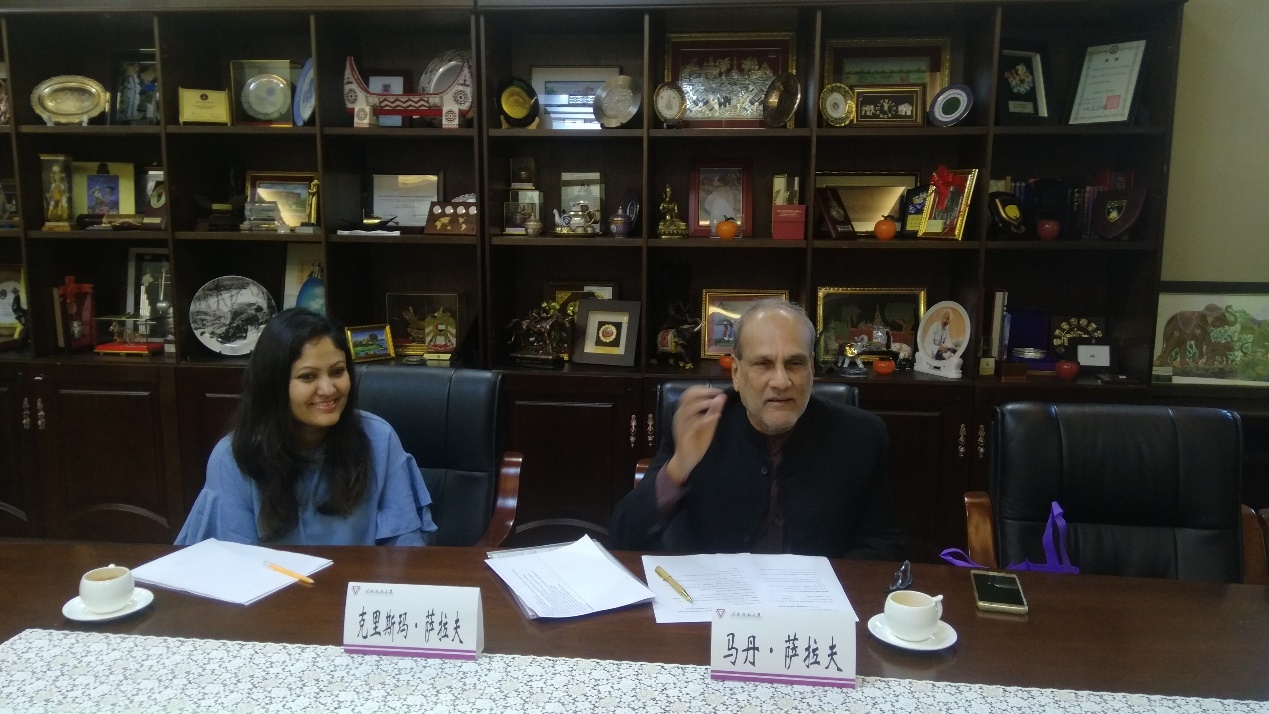 刘宗立副校长在致辞中对萨拉夫董事长、克里斯玛校长的到来表示热烈欢迎。他指出在双方的共同努力下,课堂克服种种困难,有条不紊地开展汉语教学和中国文化传播工作,亮点纷呈、成绩斐然。课堂在去年顺利通过了国家汉办的督导,为学生提供了丰富的文化活动,不断拓展汉语教育领域,积极开展多维度、多层次文化合作与交流,有效增进了中印师生情谊。