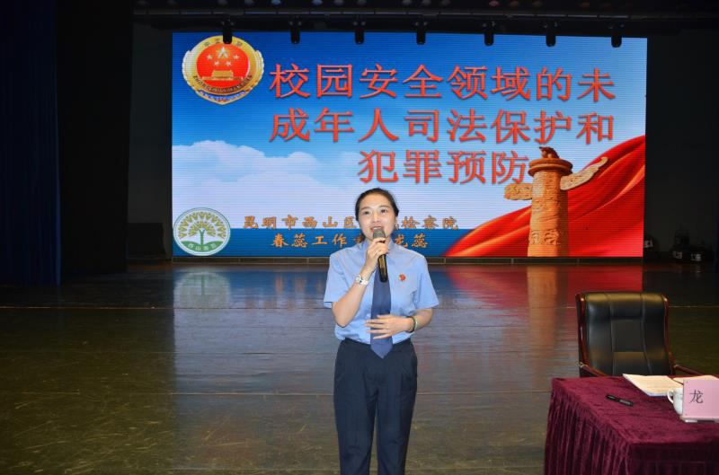2019年4月19日下午,云南省“万名校长培训计划”第二期平安校园建设宣讲活动在昆明理工大学红土会堂举行,昆明市西山区人民检察院“春蕊”工作室负责人、云南省未成年人检察业务标兵、云南省未成年人检察专业化研究小组成员、中央电视台《法律讲堂》主讲人龙蕊检察官,为云南省“万名校长培训计划”第二期全体学员作题为《校园安全领域的未成年人司法保护和犯罪预防》讲座。讲座由云南教育干部培训中心主任、西南联大干部教育学院副院长、万名校长培训计划项目办主任林卫东主持。