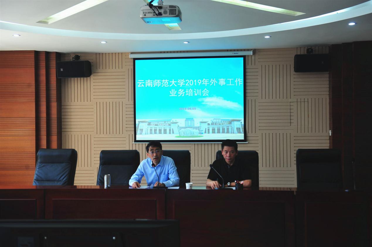 6月5日下午,我校在呈贡校区340会议室召开了2019年外事工作业务培训会。会议的主要任务是对学校各个部门进行外事工作业务培训,提高认识、了解政策、规范管理,使各学院和研究所的外事工作更好地服务于学校“双一流”建设,提升学校整体教育国际化水平。学校副书记张玮副校长刘宗立、外事工作领导小组成员单位主要负责人、民族教育信息化教育部重点实验室、汉藏语研究院、西边中心、基础教育集团办公室、各学院(含独立学院)分管外事工作领导及外事秘书、国际处全体人员参加了此次培训会。培训会分为两个阶段,由刘宗立副校长主持。