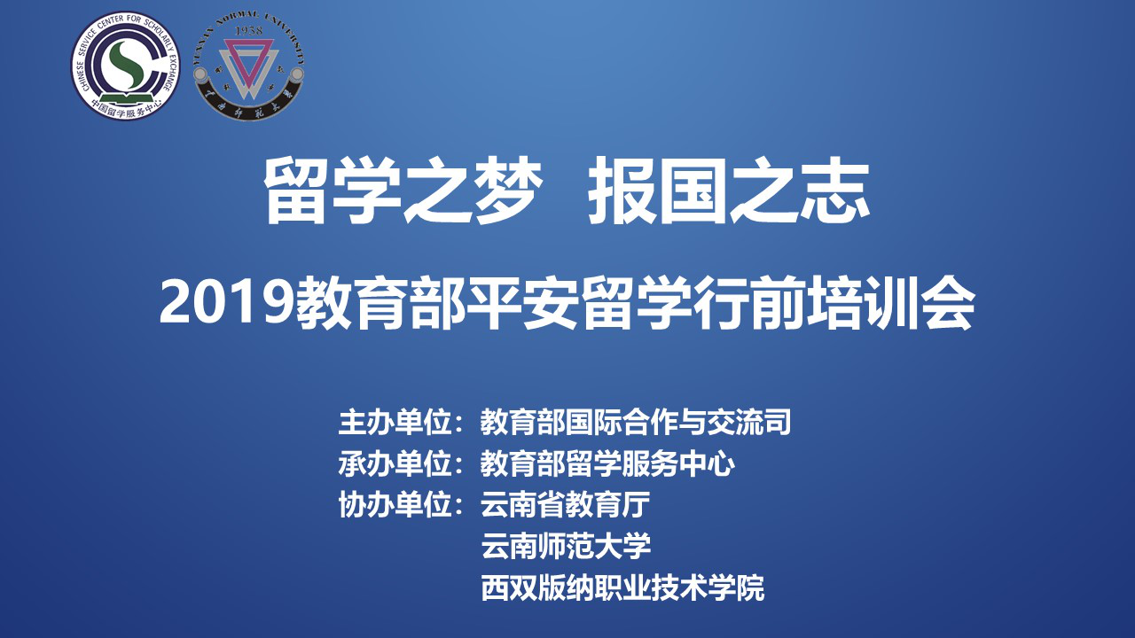 2019年6月13至14日,由教育部国际合作与交流司主办,教育部留学服务中心承办,云南省教育厅、云南师范大学国际学院“教育部出国留学培训与研究中心(后简称“中心”)”、西双版纳职业技术学院协办的“留学之梦、报国之志——2019年教育部‘平安留学’行前培训会”在西双版纳成功举办。来自云南省、北京市、河北省等省内外的近300名公派留学、自费留学人员及负责出国留学的工作人员参加了培训。