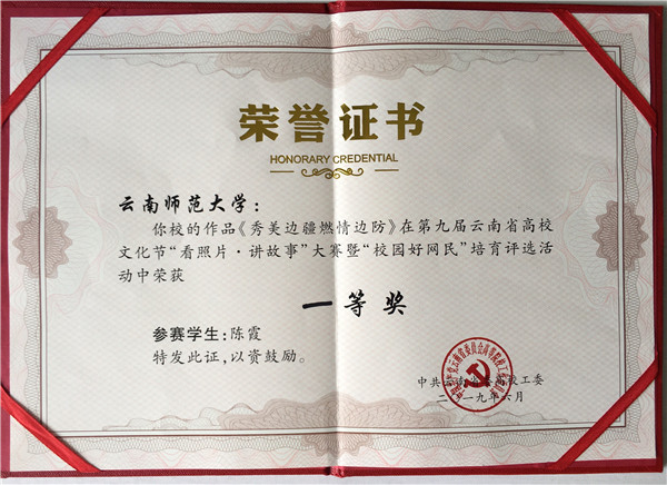 决赛中,陈霞同学用一张张真实的照片歌颂了用青春和生命守卫着祖国边疆安宁的边防战士,他们是维护祖国稳定与边疆安全的第一道防线。她表示广大青年学生要深入践行在纪念五四运动100周年大会上,习近平总书记对新时代中国青年提出的六点要求:“新时代中国青年要树立远大理想,要热爱伟大祖国,要担当时代责任,要勇于砥砺奋斗,要练就过硬本领,要锤炼品德修为。我校参赛作品得到评委们的一致认可,荣获第九届高校文化节“看照片·讲故事”大赛一等奖。