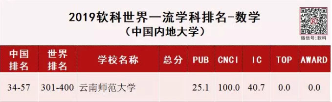 软科(6月26日)正式发布2019“软科世界一流学科排名”(ShanghaiRanking's Global Ranking of Academic Subjects)。2019年排名覆盖54个学科,涉及理学、工学、生命科学、医学和社会科学五大领域。中国内地高校表现强势,共有233所上榜,上榜总次数2001次。云南共有3所高校的6个学科上榜。我校数学学科上榜,国内排名34-57名,世界排名301-400名。