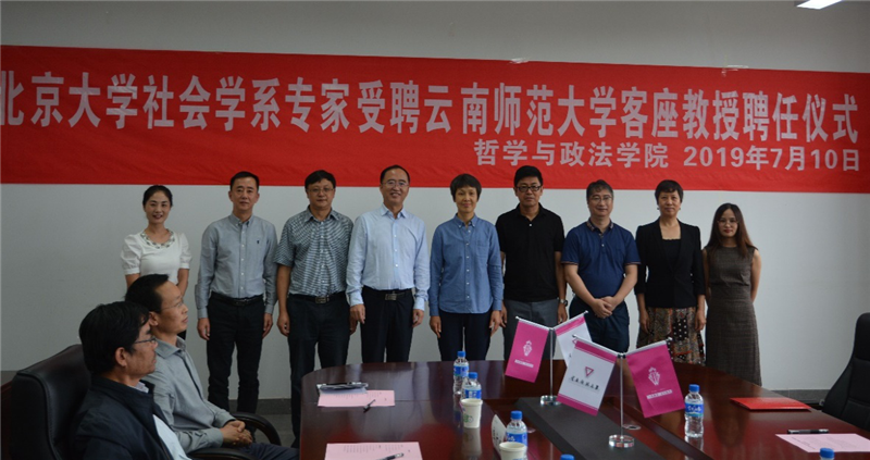 7月10日上午,我校在哲学与政法学院举行北京大学社会学系专家受聘云南师范大学客座教授聘任仪式暨云南师范大学社会学学科建设专家咨询会。北京大学社会学系主任张静教授,副主任周飞舟教授、刘能教授,社会工作专业主任马凤芝教授,社会学系黄美龄老师,我校校长蒋永文教授以及校长办公室、研究生部、哲学与政法学院党政领导班子成员和师生代表参加会议。