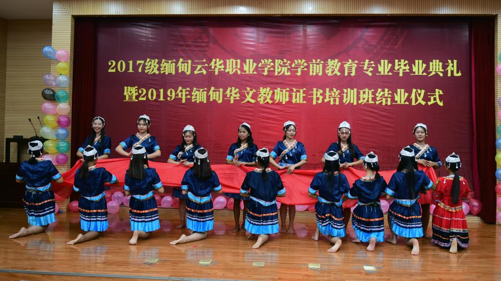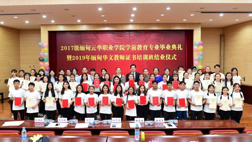 7月25日晚,我校云南华文学院举办了2017级缅甸云华职业学院学前教育专业毕业典礼暨2019年缅甸华文教师证书培训班结业仪式。云南省委统战部国外侨务处副处长甘露云、云南海外文化教育中心缅甸分中心主任唐建军,云南华文学院相关领导、教师以及2019年缅甸华文教师证书培训班、2019年缅甸华文教师教材教法培训班的89名缅甸学员参加了活动。仪式由云南华文学院常务副院长段洁云主持。
