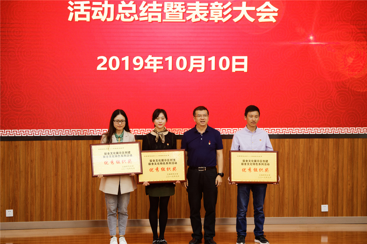 后勤保障服务中心龙梅主任宣读学校下发的《云南师范大学关于公布2019年宿舍文化节活动表彰结果的通知》文件,公布了此次宿舍文化节中的获奖单位及个人。校领导和各参会部门负责人对此次宿舍文化节中获奖的学院、集体、宿舍及个人颁发奖牌及奖状,获奖单位教师和学生代表精神饱满、笑脸盈盈依次上台领奖,并合影留念。