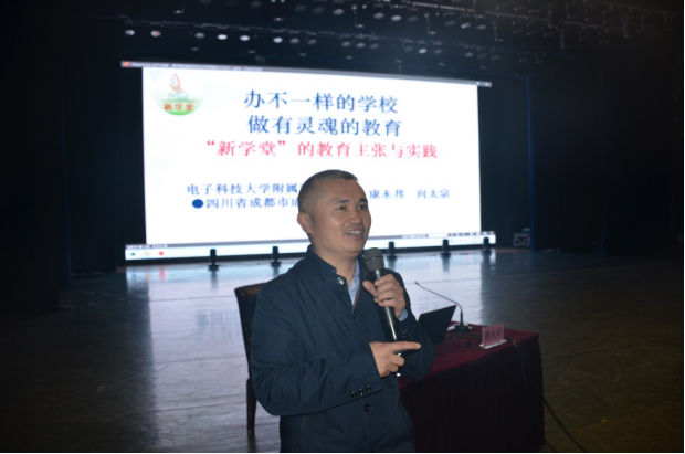 康永邦校长于1983年参加工作,1987年担任当地数学教研员,从那时起就一直在思考“什么样的教育是好教育?”。2002年通过竞争上岗成为一名中学校长,2007年担任电子科技大学附属实验小学党委书记、校长拥有丰富的教学和管理经验。讲座中,康校长从“教育问题、教育主张、办学实践”三个方面分享了“办不一样的学校,做有灵魂的教育,新学堂的教育主张”。针对当前学生“体质差、情商低、思维能力弱”的现实问题,他提出了新的教育思考:一个理论、两个理念、三大目标、四大誓言、十三项改革。一个理论:五指理论,五个长短、粗细虽不一样,但每个指头都能找到自己的位置,教育应引导并帮助学生找到他们各自的位置。两个理念:一是动起来,让每个生命更精彩;二是心系健康,赢在习惯。三大目标:通过体育锻炼增强学生体质,达到“身体好”的目标;通过活动的开展培养学生自信、感恩、爱国的精神,达到“情商高”的目标;通过兴趣的驱动提升学生学习的兴趣,提升学生综合素养,达到“能力强”的目标。四大誓言:干部誓言——心存善念、先思先行、求实务虚、成人成事;教师誓言——立大志、重细节、师生共养好习惯;学生誓言——管住自己、立志成长、学好本领、报效祖国;家长誓言——家长好好学习、学生天天向上。康永邦校长对学校进行了十三项改革通过一系列的举措达成培养德智体美劳全面发展的社会主义事业的建设者和接班人的育人目标。