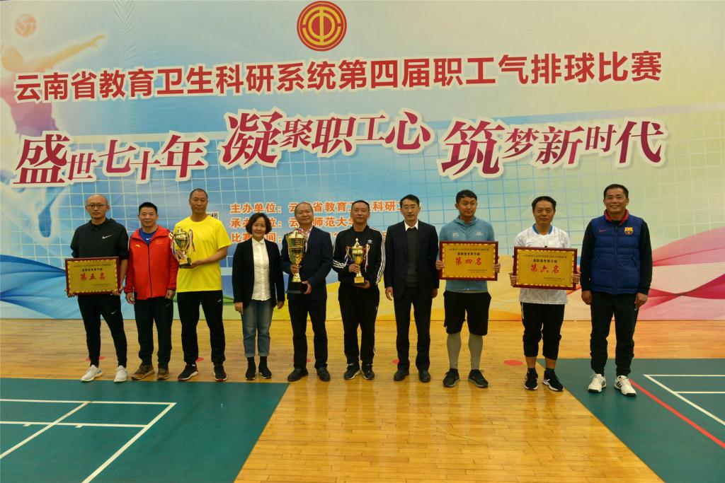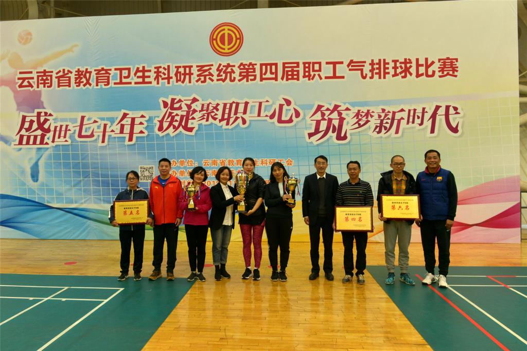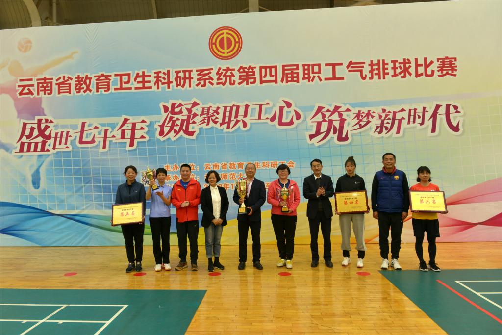 盛世七十年,凝聚职工心,筑梦新时代。经过5天,共计434场比赛的激烈角逐,11月22日下午,云南省教育卫生科研系统第四届职工气排球比赛圆满落下帷幕,闭幕式在我校呈贡主校区和园体育馆举行。云南省教育卫生科研工会副主席、女工委主任田咏华,云南师范大学党委副书记张玮,云南师范大学副校长刘宗立,云南师范大学工会常务副主席金黄斌等出席了闭幕式。