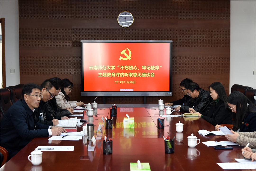 11月28日上午,为进一步扎实推进我校的主题教育活动,校党委领导班子和学校“不忘初心、牢记使命”主题教育评估听取意见座谈会在呈贡主校区办公楼第四会议室召开。省委第十七指导组刘炜同志,学校各级党代表、人大代表、政协委员,师生党员代表、群众代表,工作对象、服务对象,学院党委书记代表、学院师生党支部书记代表、机关党支部书记代表30余人参会,会议由党委副书记、校党委“不忘初心、牢记使命”主题教育领导小组副组长张玮主持。