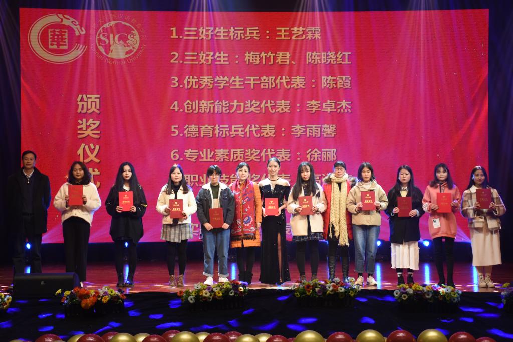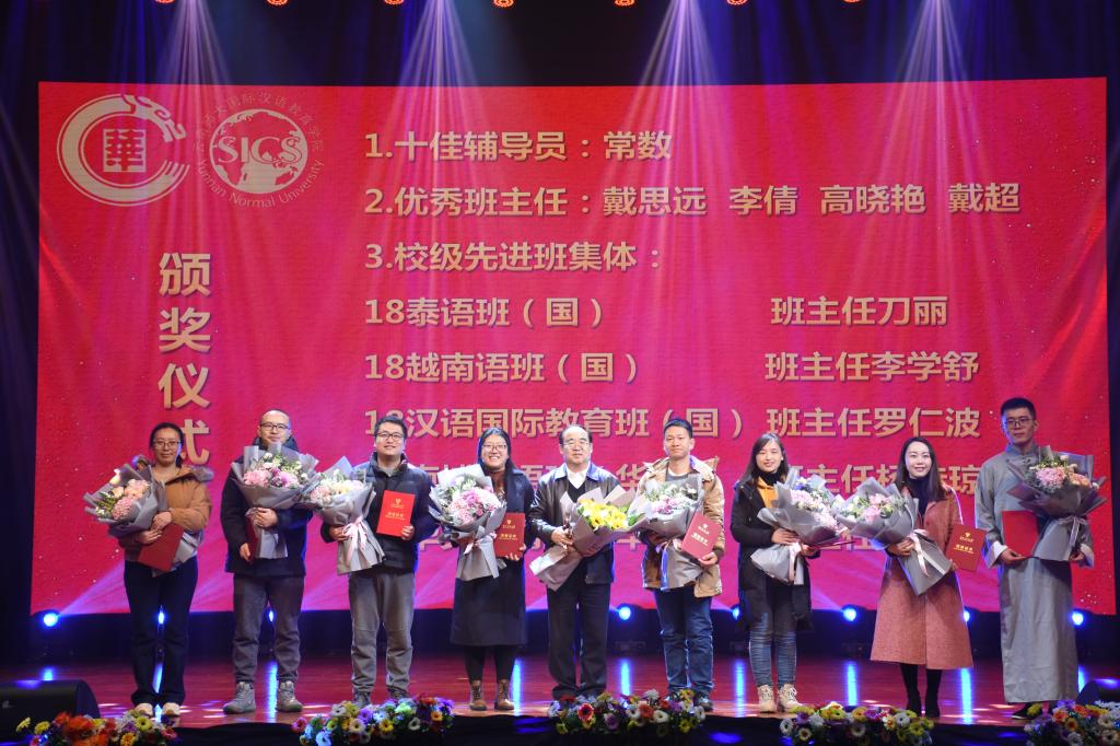 活动中还进行了2019年度优秀师生的颁奖仪式云南师范大学副校长武友德为获奖教师颁奖,2019年度,华文国语学院共有6名教师、5个班集体获得校级荣誉称号,辅导员常数老师荣获十佳辅导员称号,高萍老师荣获最关爱学生班主任称号,高晓艳老师、李倩老师、戴超老师、戴思远老师分别荣获优秀班主任称号这些辛勤耕耘在工作岗位上的园丁们,用自己持久的热情和职业素养响应了习近平总书记对广大教师提出的“争做‘四有’好老师”的号召。