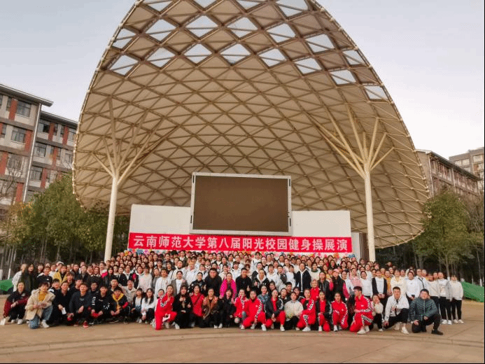 2019年12月19日下午,由学生工作处承办,体育学院协办的课外素质教育活动----第八届阳光健身操汇报展演在云南师范大学呈贡校区东区贝壳广场举行。云南师范大学学生处和体育学院相关老师以及各学院同学们到场观看了汇报展演。本次展演吸引了来自传媒学院、经管学院、文学院、华文学院、体育学院等14个学院近600余名阳光健身操爱好者参加。