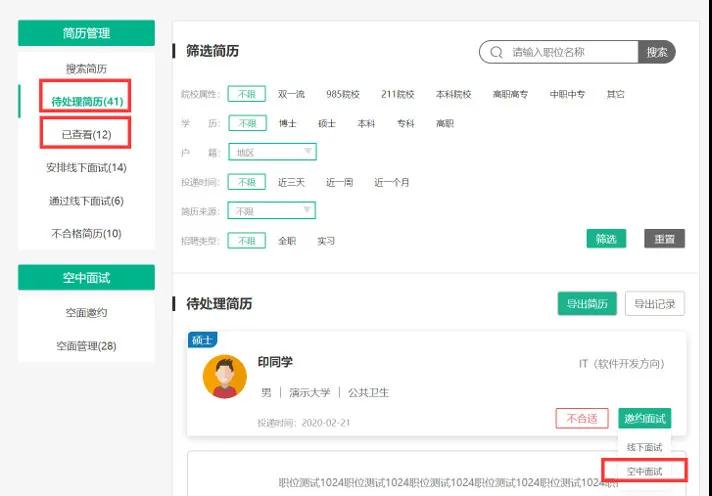 在【简历管理】模块中,查看学生投递的简历,进行空中面试邀请,在约定的时间与学生进行线上视频面试。