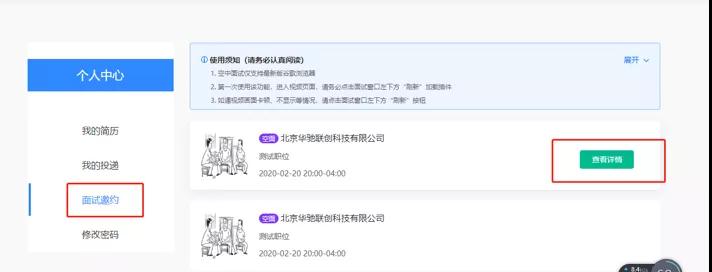个人中心->面试邀约中,可查看用人单位空中面试邀请,并开始空中面试。