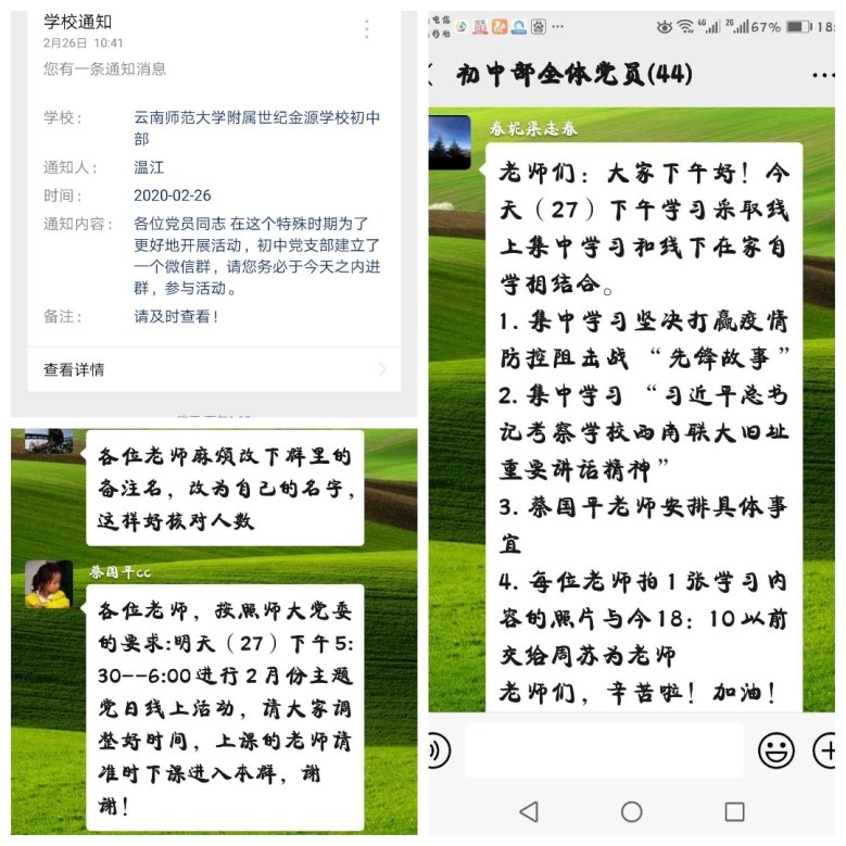 新型冠状病毒感染的肺炎疫情发生以来,根据云南师范大学党委、云南师范大学附属世纪金源学校党委通知精神,学校各学部党支部积极发挥战斗堡垒和先锋模范作用,为打赢疫情阻击战贡献组织力量。每位党员教师务必践行:在延期开学期间,将离校不离教,从“假期模式”转入“战时状态”,积极参与到各班级组织的网络宣传和教育中去。面对线上教学,我们应沉淀下来积极思考,积极发挥学科备课组的团队力量,认真备课,敢于创新,采取多种形式的授课方式,同时加强对课后作业的质量监控,严把教学质量关。当然,线上教学,我们也会遇到很多困难与挑战,作为党员教师的我们应勇于面对、敢于担当,克服重重困难,努力做到为学生提供高质量的教学服务和指导。