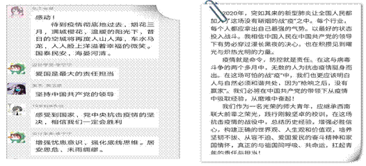 课后,结合视频公开课情况,我校认真组织了在线讨论,师生反响热烈。教师们一致表示,“全国大学生同上一堂疫情防控思政大课”对广大教师既是一次爱国主义的洗礼,也是新时代如何上好思政课,发挥思政课铸魂育人“第一课”作用的生动展示。马克思主义学院“中国近现代史纲要”教研室教师袁弋胭认为,这次思政课是一堂精彩的示范课、一堂典型的线上教学展示课,也是一次高质量的集体备课,对新时代开展好思政课教育教学,特别是把学校思想政治理论课教学优势转化为支持防疫斗争的强大力量发挥了积极的作用。研究生思政课教师石超认为:“习近平总书记提出要紧紧依靠人民群众打赢防疫人民战争,体现了唯物史观关于人民群众是历史创造者的思想,中国用实际行动诠释和推动了自己倡议的关于人类命运共同体思想。这次防疫抗疫是最生动的思政课,我们应利用身边人、身边事讲好‘中国故事’‘抗疫故事’,让思政课真正‘活’起来。”