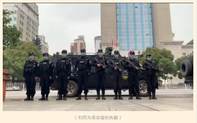 到达战“疫”一线,李念玺所属的特警支队主要负责各个辖区的治安清查和教育宣讲,不断提醒群众疫情当前不要走街串巷以及聚会,还负责各个卡点的执勤以及街面巡逻防控。从早上7时开始到晚上23时,每天不间断工作长达16个小时。湖北疫情爆发后,整个黄石市实行了整个城区的交通管制以及所有街面店铺暂停营业,街上鲜少看到行人。他在进行日常巡逻时,一名妇女称她的小孩身体不适,有发热症状,由于街面没有任何营业车辆可搭载,就向特警支队求助,希望带他们一家三口去医院检查。在请示上级领导后,李念玺就和支队同事一起送他们去了医院,之后也一直陪着家属配合医护人员,事后一家三口不断鞠躬致谢。正是这时,他明白了:“身为一名公务员、一名光荣的人民警察必须充分地践行人民警察为人民的宗旨,将广大群众的最根本利益放在首位”。人民的理解就是对他以及和他一样在基层防疫前线工作人员最大的鼓励,也是支撑他不畏疫情、不惧感染的坚实后盾。他坚定地说:“只有始终保持初心,我们的民族、国家才会永久的和谐与繁荣,我们社会的正气才会持久弘扬!”李念玺用他的实际行动充分践行了人民警察为人民的铮铮誓言。