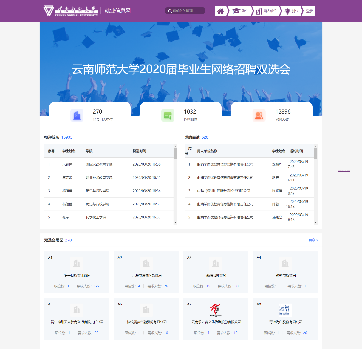 为深入贯彻落实党中央、国务院有关高校毕业生就业的决策部署,落实云南省委省政府的工作要求,在云南省教育厅的精心指导下,我校就业处于3月17-20日联合举办了云南师范大学2020年毕业生网络招聘双选会。