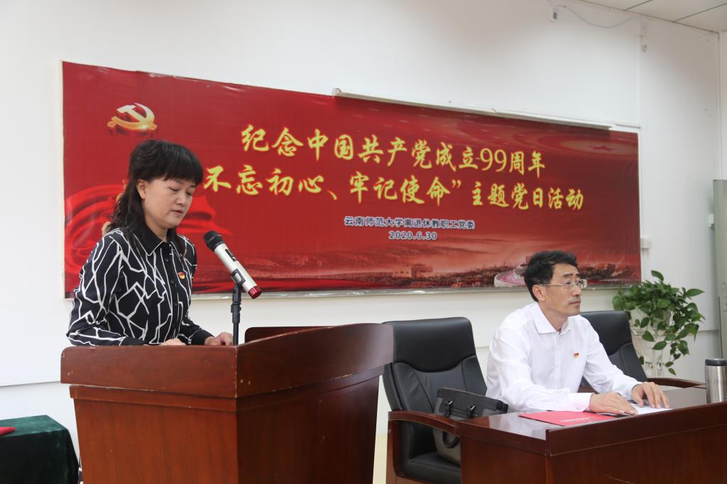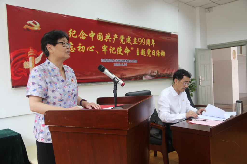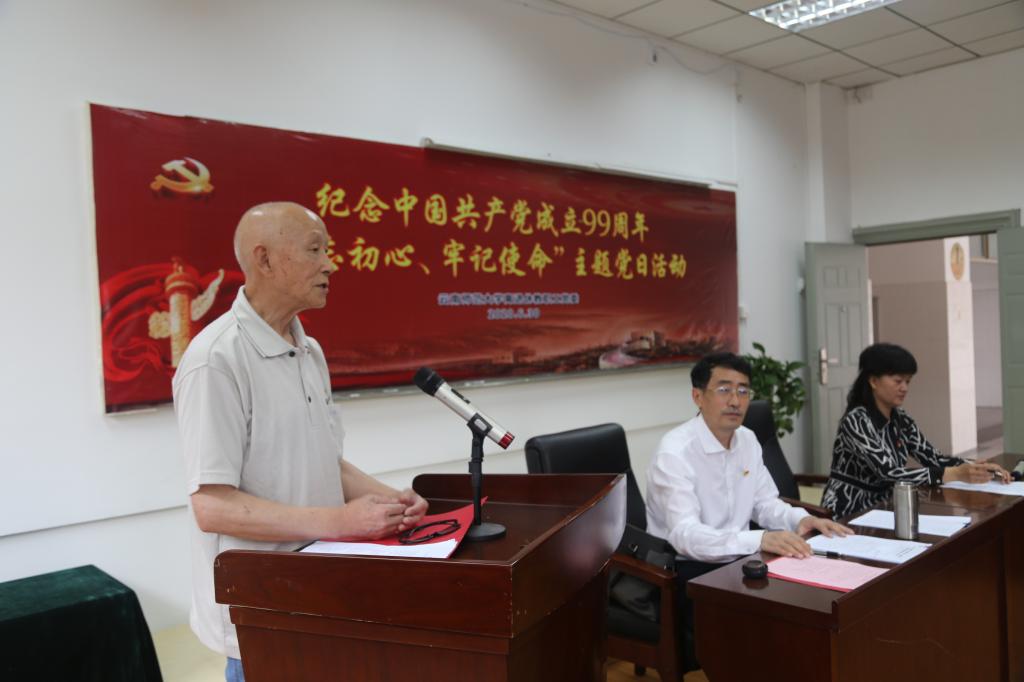 张玮副书记在活动中作了讲话。张副书记向受表彰的党支部、优秀党员、优秀党务工作者、优秀作品获奖者表示祝贺。他表示,在党的99岁生日到来之际举办“不忘初心、牢记使命”主题党日活动,其目的是回顾党的光辉历史,讴歌党的丰功伟绩,进一步激发党组织活力,增强老党员的政治荣誉感、组织归属感,增强“四个意识”、坚定“四个自信”、做到“两个维护”。同时,张副书记还向老党员们汇报了学校学习宣传贯彻习近平总书记考察西南联大旧址指示精神的基本情况。张副书记强调,老党员们要不忘初心、牢记使命,永葆爱党、忧党、兴党、护党的政治本色。“莫道桑榆晚,为霞尚满天”,希望老党员们要充分发挥经验优势、政治优势、威望优势,为党的事业增添正能量,为学校的改革发展,为学校加快高水平大学建设贡献余热。