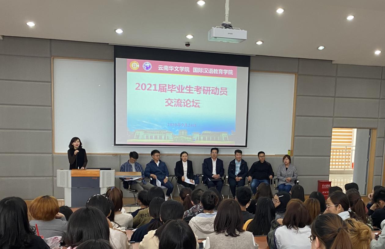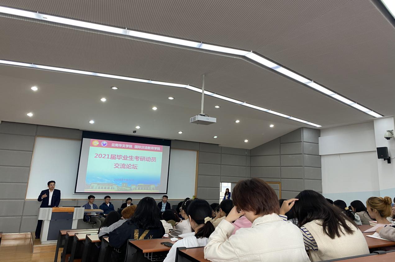 为进一步落实学校关于鼓励毕业生考研的通知要求,调动2021届毕业生考研积极性,9月24日下午,云南华文学院在同析2号楼召开了2021届毕业生考研动员交流论坛。云南华文学院院长王秀成、副院长黄启庆、华文教育系主任陈萍、越南语系主任熊世平、泰语系主任何冬梅、缅甸语系主任王丽凤、老挝语系主任巴国鑫、柬埔寨语系主任朱元勋、国内学生教务办其他老师、在读研究生代表以及2021届全体本科生参加了论坛。论坛由学院国内学生教务办主任张磊主持。