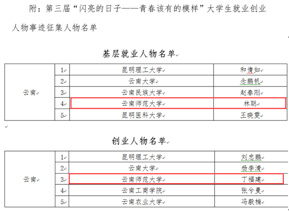 “闪亮的日子—青春该有的模样”大学生就业创业人物事迹征集活动分为校级选拔、省级推荐、国家级评选三个阶段。为发挥榜样引领作用,今年活动启动以来,就业处积极配合云南省大中专毕业生就业指导与服务中心推进具体工作,通过开展宣传动员、招募评审和材料优化等系列工作,充分发掘近几年在基层就业、大学生创业和军营大学生战士等领域就业的大学生就业典型事例,确保了推荐人选的代表性和事迹材料的生动性。本次毕业生入选,不但向社会展示了师大学子的良好形象,发挥了示范典型的引领作用,也彰显了我校就业创业的成果和特色,体现了毕业生更高质量和更充分就业,推动建设以教师教育为特色的高水平大学。