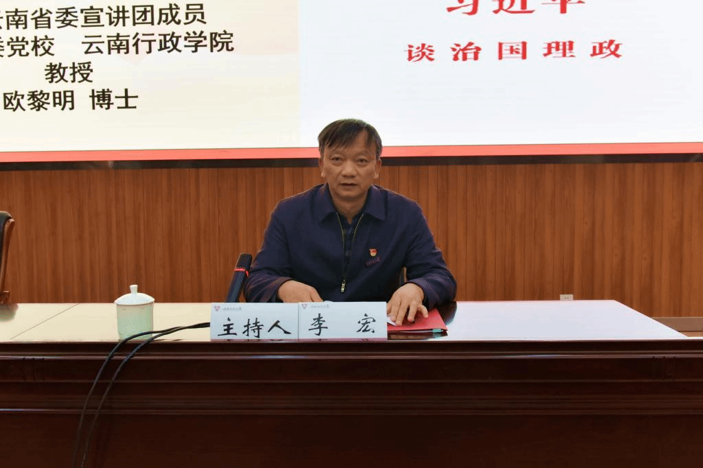 为认真学习宣传《习近平谈治国理政》第三卷,把学习宣传贯彻习近平新时代中国特色社会主义思想和习近平总书记考察云南重要讲话精神不断引向深入,引导师生读原著、学原文、悟原理,12月2日,我校于呈贡校区汇学二号楼报告厅举行《习近平谈治国理政》第三卷省委宣讲团宣讲会暨校(院)两级党委理论学习中心组(扩大)学习会。省委宣讲团成员、省委党校(云南行政学院)原副校(院)长欧黎明教授应邀作主题宣讲,宣讲会由校党委副书记李宏主持。全体校领导、全校副处级及以上领导干部、思政课教师、部分教师和学生代表参加了宣讲会。