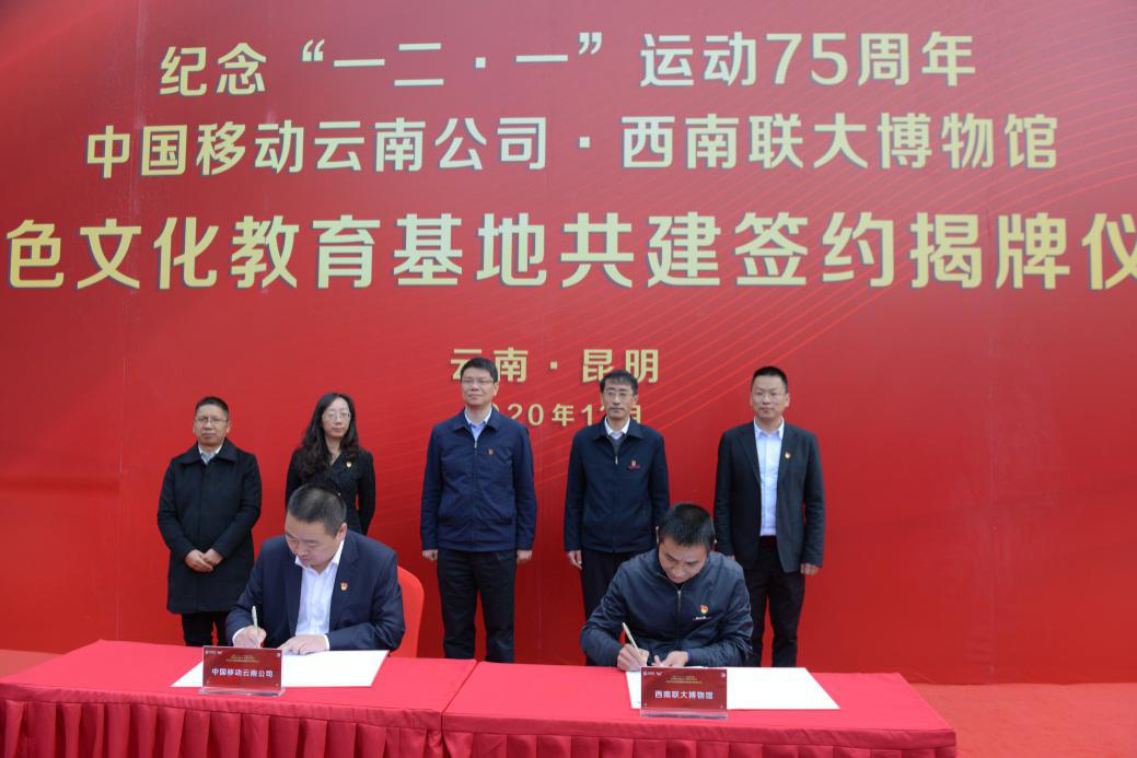 中国移动云南公司党委委员、副总经理、直属机关党委书记黄振旺,我校西南联大研究所副所长、西南联大博物馆党支部书记朱俊,分别代表双方签订“红色文化教育基地”共建协议。我校党委副书记张玮、中国移动云南公司总经理葛松海为“红色文化教育基地”揭牌。