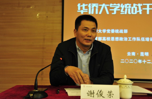 华侨大学党委统战部谢俊荣部长在致辞中首先感谢云南师范大学的鼎力支持和精心安排,为培训班搭建了良好的学习平台。他强调,华侨大学直属中央统战部,以“为侨服务,传播中华文化”为办学宗旨,统战特色鲜明,任务艰巨,使命光荣。他要求,要以此次培训为契机,积极参与学习和研讨,严格遵守培训纪律,进一步增强统战意识,提升统战业务能力,确保学校统战工作能够持续、更好的向前发展。