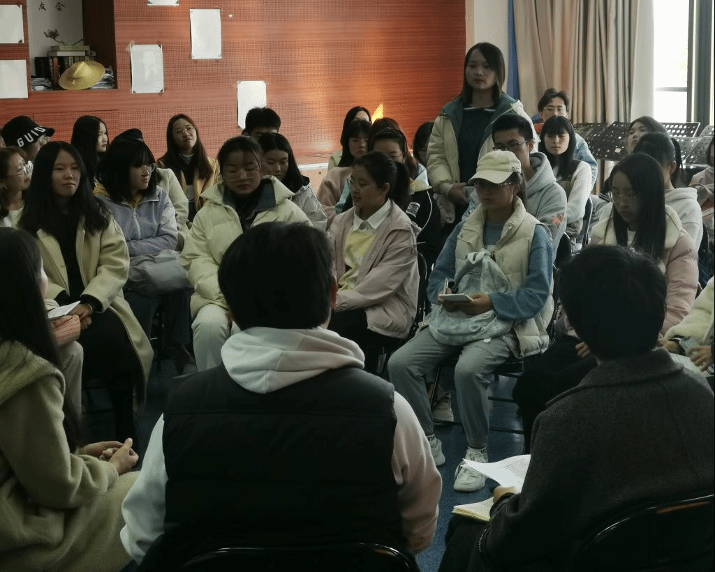 各学生代表纷纷发言,其中,马克思主义学院子梦婷同学介绍说:“张桂梅老师生活简朴,重视红色教育,要求同学们背《弟子规》,学红军长征故事、黄继光英雄事迹,引导同学们热爱党热爱祖国,对学生影响大;她关爱全体学生,从学习成绩第一名到最后一名她都没有放弃,学校学习风气好。”史政学院胡泽欢和数学学院胡泽凤两姐妹都是华坪女高毕业生,在她们的回忆里,张桂梅老师特别注重校园卫生管理,人人爱卫生,人人参加校园卫生清扫活动,教室、宿舍、操场整洁干净。教育学部王颖同学家姐妹三人都上了华坪女高,接受着张桂梅老师细致入微的关爱,她回忆,张老师每天第一个起床开路灯,时间安排井井有条,通过学生看红色影片、党员戴党员徽章、团员戴团徽、开展升旗仪式加强理想信念教育。经管学院杨志兰同学说:“女高学生清一色齐耳短发,节约梳洗时间;新生报到那一刻起,学生自己拿行李,家长不能帮忙,感觉进了校门起自己开始独立了。”物电学院李庭凤表示在张桂梅老师身上感受到了共产党员是真正为人民服务的。信息学院郎贵玲同学眼中的张桂梅老师不论学生成绩如何,都关心爱护女高的每一个学生,大家都很敬畏她,她是大家心目中的“张妈妈”。
