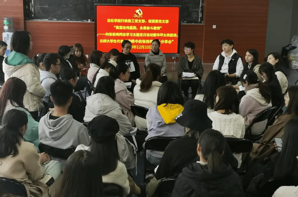 2020年12月10日下午,法社学院行政党支部、校团委党支部、各学院(部)团委书记、华坪女高就读我校31名学生代表,在呈贡校区大学生活动中心301室开展“展望宏伟蓝图,永葆奋斗激情”——向张桂梅同志学习主题党日活动暨华坪女高就读云师大学生代表“我眼中的张桂梅校长”分享会。