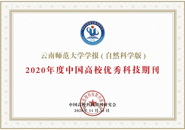 《云南师范大学学报(自然科学版)》荣获中国高校科技期刊研究会颁发的“2020年度中国高校优秀科技期刊”。该项目遴选依据北大核心数据、CSCD数据、科技核心数据、知网学术评价数据、万方扩刊版数据、中信所精品科技期刊和百杰期刊及知网国际影响力数据等第三方客观数据,经过加权计算,从中国高校科技期刊研究会1000多家期刊中遴选产生。这是本刊继2016年和2018年荣获该奖项之后连续第三次获得该奖项。