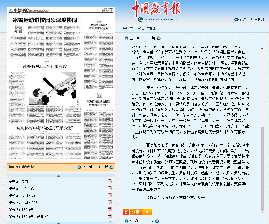 此前,中共中央办公厅、国务院办公厅印发了《关于全面加强和改进新时代学校体育工作的意见》,进一步明确了体育中考的方向,要求进一步扩大体育的分值和影响力。社会上刮起一股“体育课外辅导风”。很多家长在给体育中考点赞的同时,也担心自己孩子拿不到高分,参加课外辅导又会增加经济负担。我校体育学院院长聂真新教授以《应对体育中考不必急于“开小灶”》为题,在《中国教育报》中教评论版围绕三个方面回应了社会舆论并提出针对性解决方案,对中考体育改革的不断深化具有重要指导意义。