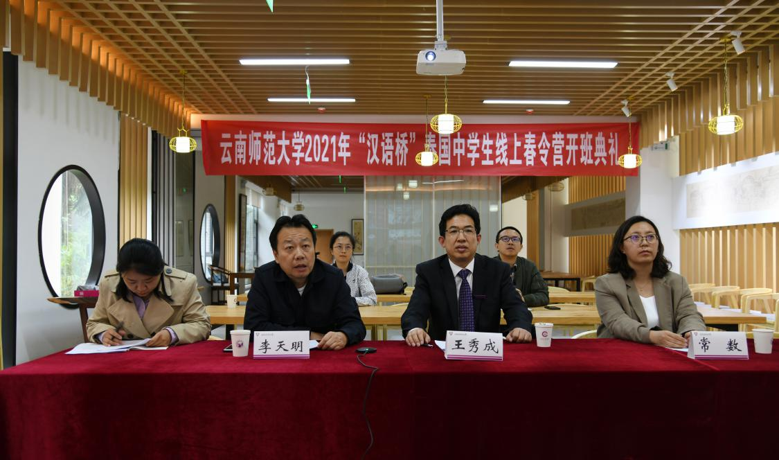 为进一步做好中文国际推广与中外人文交流工作,延续“汉语桥”项目热度,我校国际汉语教育学院承办了国家中外语言交流合作中心2021“汉语桥”泰国中学生线上春令营项目。4月4日上午,春令营开班典礼以“云连线、云直播”的方式,在我校呈贡主校区同析2号楼茶艺教室、泰国清迈地区拜县中学大礼堂和清迈大学孔子学院会议室三地同时举办。国际汉语教育学院院长王秀成、党委副书记常数、副院长李天明,泰国清迈地区拜县中学副校长金达女士,清迈大学孔子学院中方院长沈毅等领导出席,云南师范大学汉语国际推广师资培训基地(昆明)全体工作人员、拜县中学教师代表以及122名春令营营员学生参加,开班典礼由李天明副院长主持。