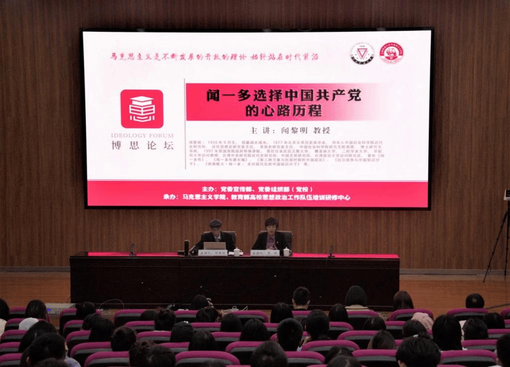 闻黎明教授围绕闻一多早年对中国共产党的认识、爱国精神的影响、热烈的爱国情绪、文化救国的志向、埋头治学不问政治、迅猛的思想转变、最后一次演讲等七个方面内容,满怀深情地讲述了爷爷闻一多先生在中国共产党引领下政治思想转变的故事,生动讲述了他最终选择中国共产党的心路历程。闻黎明教授指出,“闻一多的一生是中国知识分子探索救国的一生;闻一多的转变,既是一个正直知识分子的良心自觉,更是中国知识分子索求民族独立、国家富强,必然选择中国共产党的逻辑归宿。”