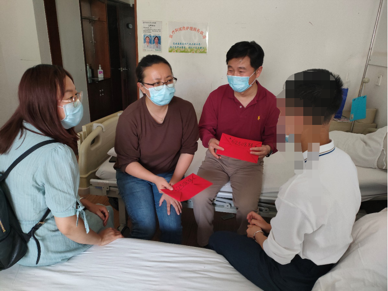 学院领导得知患病同学家庭经济困难的情况,第一时间组织全院学生和老师进行爱心捐款,帮助患病同学度过难关。仅2天时间,就收到师生及家长爱心捐款62825.54元。4月3日,学院党委副书记常数、副院长黄启庆代表学院全体师生到医院看望患病同学,将爱心捐款转交给她,送去了全院师生的温暖关怀,鼓励她乐观坚强面对。班主任老师帮助她协调住院床位,看到她放疗后身体虚弱,还亲自炖了鸡汤、买了水果送到医院。目前,该生病情有所好转,学院领导、班主任、辅导员、同学们陆续到医院看望,一起帮助她与病魔抗争。