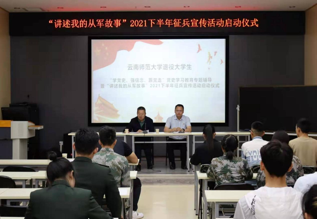 2021年4月29日下午,副校长蔡金红、学生处和武装部相关负责人在云南师范大学实训楼101报告厅举办了云南师范大学2021年下半年“讲述我的从军故事”征兵宣传活动启动仪式。