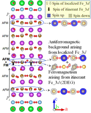 图3.超晶格中BiFeO3的磁性:图中紫色,褐色,红色小球分别代表Bi,Fe,O离子。左图中白色箭头示意了BiFeO3的反铁磁背景,黑色箭头示意了巡游的铁磁性;右图的蓝色和灰色分别是计算出的自旋上和自旋下的电子密度。在中间的铁电畴壁上,可以看到局域反铁磁和巡游铁磁的共存。