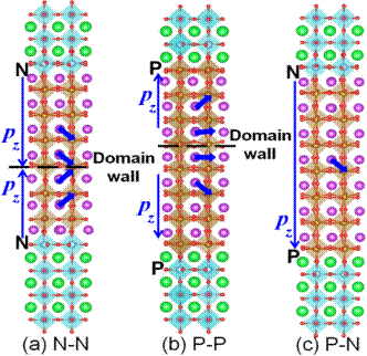 图1.SrTiO3/BiFeO3/SrTiO3超晶格模型,蓝色箭头标记Bi离子的极化位移。(a)上下界面均为N型,界面将诱导头对头的铁电畴;(b)上下界面均为P型,界面将诱导尾对尾的铁电畴;(b)上下界面分别为N型和P型,界面将诱导单向的铁电极化。