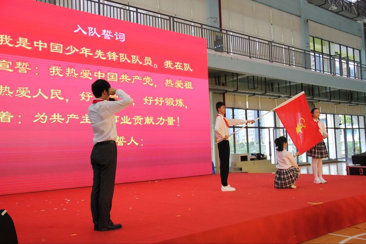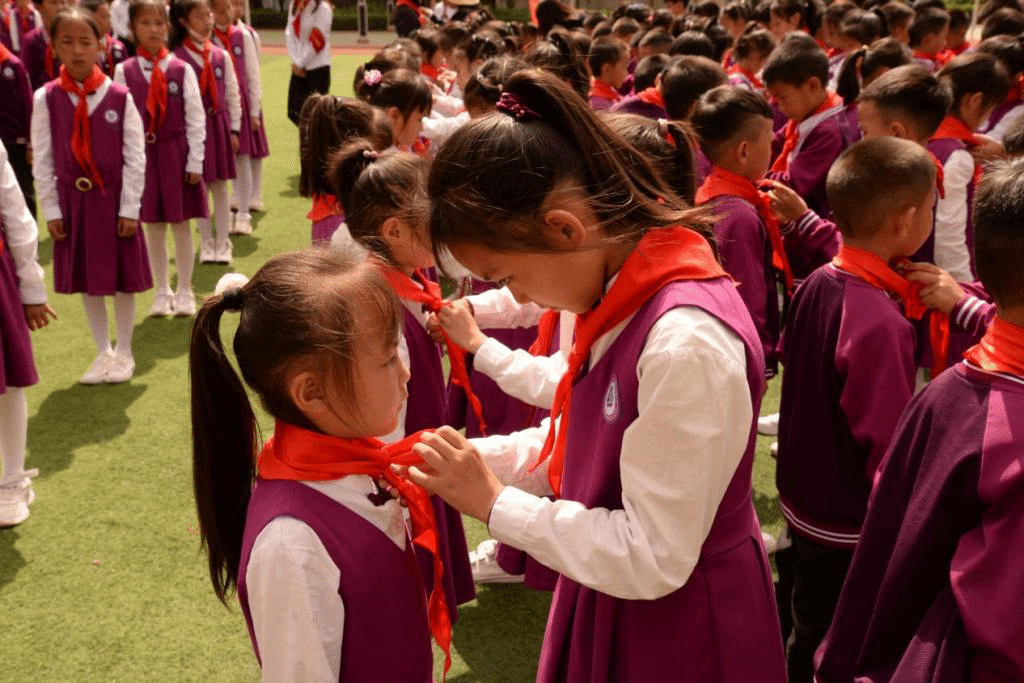 在队旗的见证下,新入队的少先队员们戴上了鲜艳的红领巾,成为了一名光荣的少先队员。火红的队旗高高飘扬,指引少儿前进的方向。鲜艳的红领巾系满理想,如一只红船,载着少儿扬帆远航。