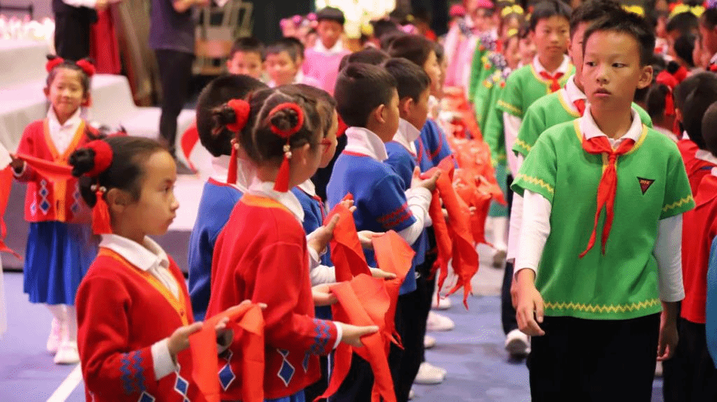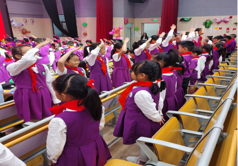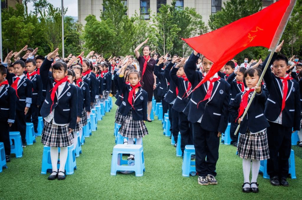 云南师范大学附属润城学校(小学部)举行第七届红领巾节“童心向党,争做新时代好队员”一年级新入少先队队员入队仪式,为孩子们扣好人生第一粒扣子。
