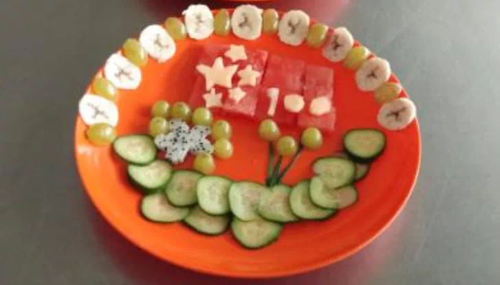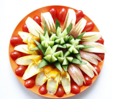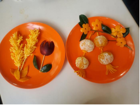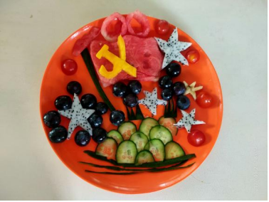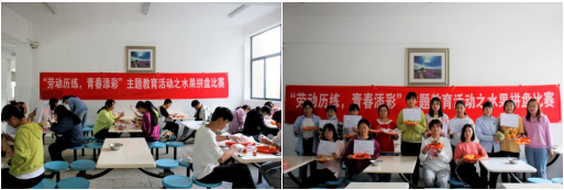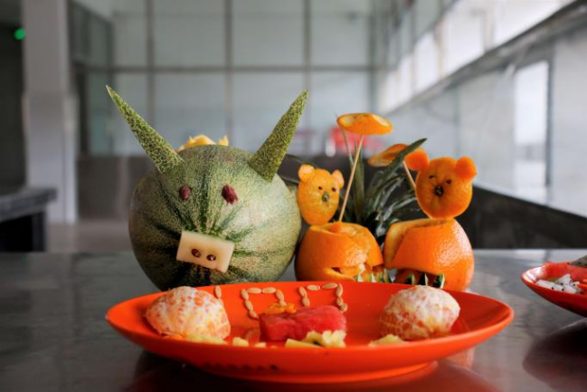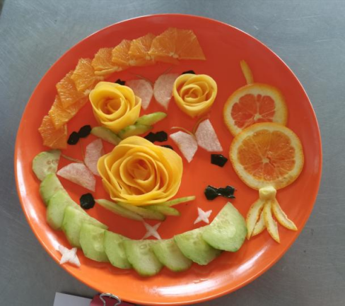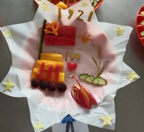 本次比赛的创作内容围绕庆祝建党100周年、节约粮食、珍惜劳动成果展开,创作要求为节约、创新、美观、有意义,同学们利用水果刀、牙签等工具雕刻、摆盘,创造出造型多样、寓意丰富的水果拼盘作品。比赛共评选出一等奖1组,二等奖2组,三等奖4组。