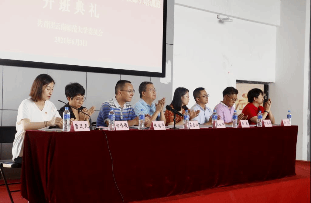 2021年6月3日,云南师范大学“青年马克思主义者培养工程”全国研究培训基地2021年“学党史 强信念 跟党走”团学骨干(青年教师)培训班开班典礼在呈贡校区大学生活动中心308举行。副校长蔡金红,党委宣传部副部长伏云辉、学生工作部(处)处长张国华、研究生处副处长向泰、马克思主义学院副院长柳榜华,校团委领导班子成员,各学院(学部)团委书记、团委副书记,以及本期培训班全体学员参加了开班典礼。