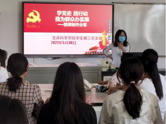 2021年5月30日生命科学学院学生第三党支部开展“我为群众办实事”活动。此活动以前期收集到的问题为导向,把学习党史同解决实际问题结合起来,为进一步提升支部同学教学技能和手段,支部教师党员韩宁老师就如何制作精美微课为大家进行了分享。
