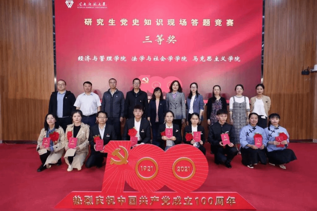 党史知识答题竞赛结束后,举行了研究生课外科技学术文体活动颁奖典礼,对2021年春季学期在党史知识现场答题竞赛、党史知识学习征文比赛、党史知识网络答题、“网上重走长征路”暨推动“四史”学习教育网络答题、研究生优秀成果评选、云南省优秀学生干部评选、云南省三好学生评选、云南师范大学秀学生干部评选、研究生十佳歌手大赛、“研究生杯”男子足球赛、“研究生杯”女子气排球赛等活动中取得优异成绩的研究生进行表彰,到场领导为获奖研究生一一颁奖。