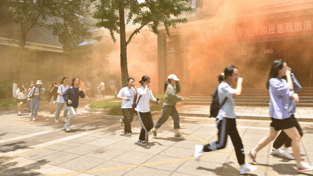 下午13:00,牛治亮副校长宣布云南师范大学2021年灭火和应急疏散演练正式开始。学生宿舍消防警报响起,放置在预定地点的烟雾弹点燃,参加演练的学生紧捂口鼻、低头弯腰,按照引导员的引导,陆续、快速有序从宿舍楼内撤离至室外安全区。