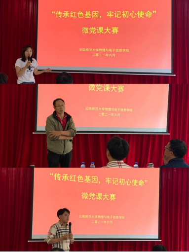 为从党的百年伟大奋斗历程中汲取继续前进的智慧和力量,深入学习贯彻习近平新时代中国特色社会主义思想,巩固深化“不忘初心、牢记使命”主题教育成果,全面开展党史学习教育,激励全院师生满怀信心迈进全面建设社会主义现代化国家新征程。学院党委围绕立德树人的根本任务,结合学院“四轮驱动”工程,充分发挥党员的引领、示范和带头作用,坚持以讲促学、以知促行,决定举办“传承红色基因、牢记初心使命”微党课比赛。6月28日下午,“传承红色基因、牢记初心使命”微党课比赛决赛在学院“党员之家”举行,比赛由物理与电子信息学院党委书记王世波同志、团委书记陈阁同志、教工党支部蔡武德同志、教工党支部王静同志担任评委,组织员梁烨同志担任主持。