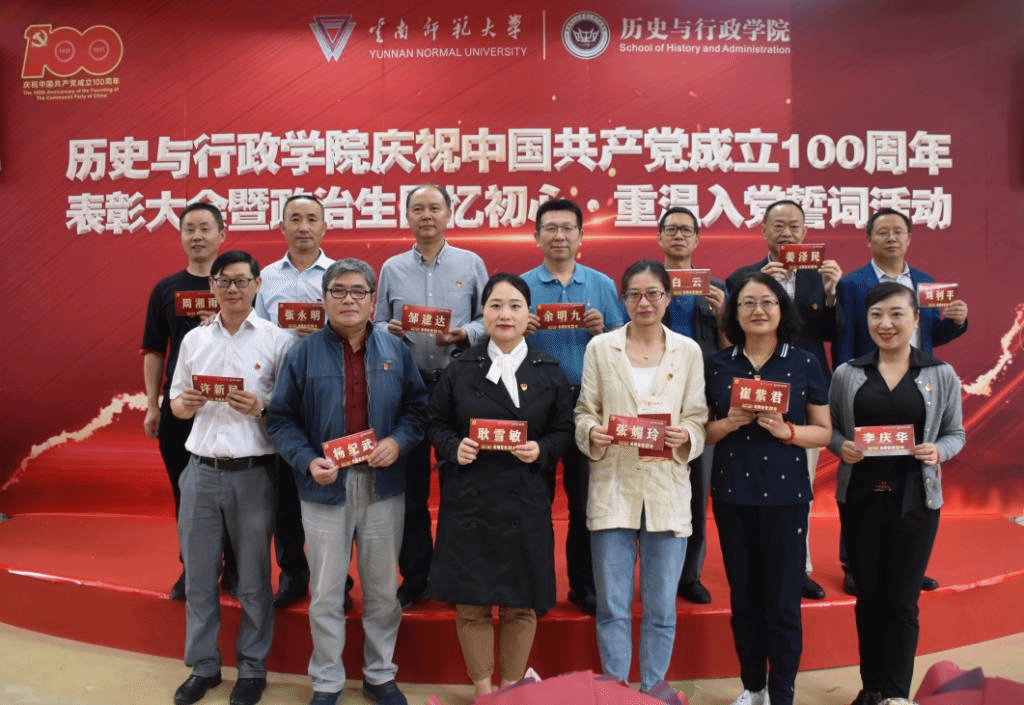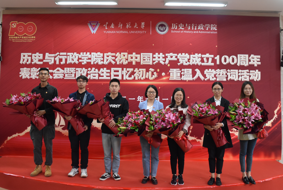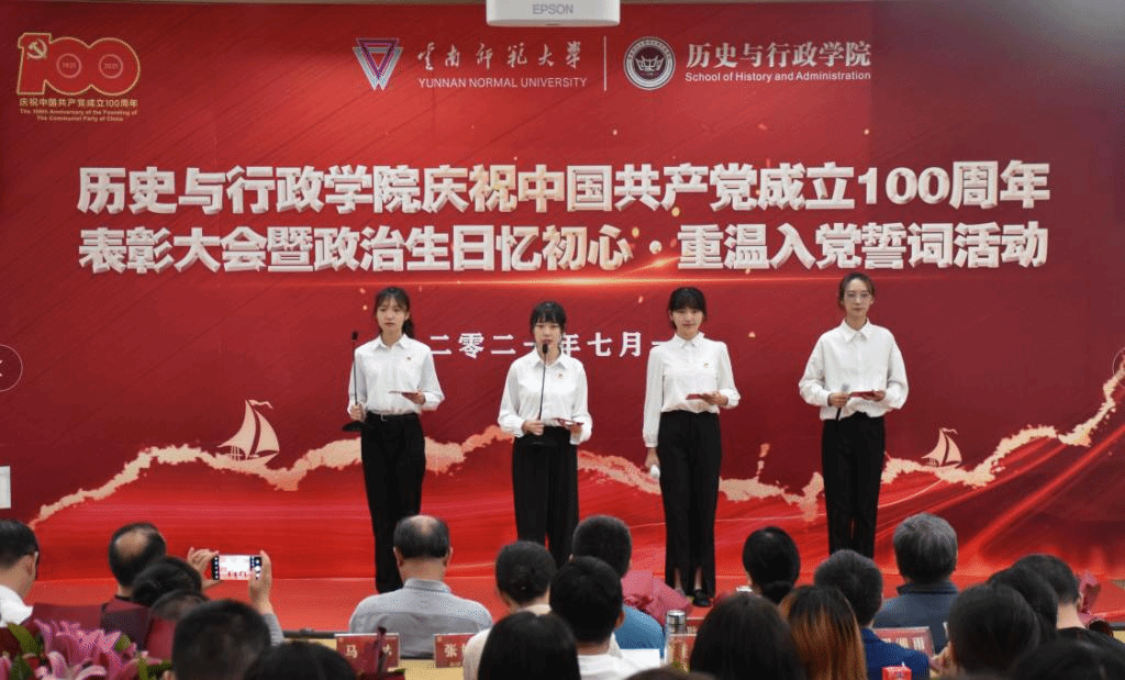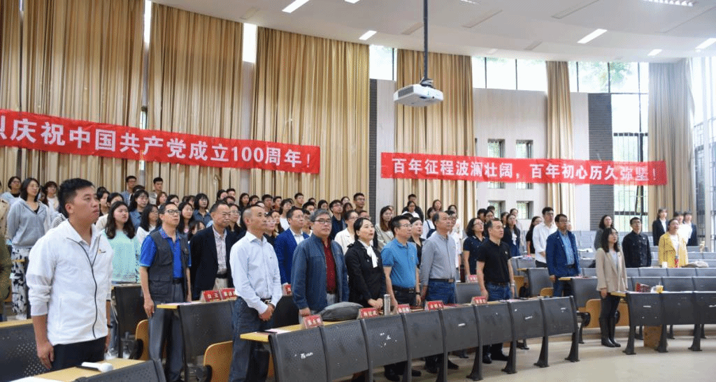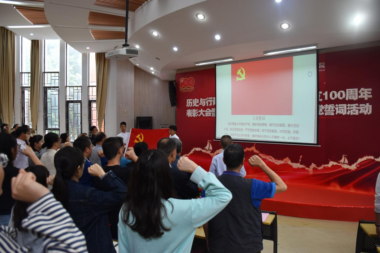 为热烈庆祝中国共产党成立100周年,7月1日上午,历史与行政学院140余名师生党员在学院报告厅集中收听收看党中央庆祝中国共产党成立100周年大会,随后举行庆祝中国共产党成立100周年表彰大会暨政治生日忆初心•重温入党誓词活动。大会对获学校优秀党员、优秀党务工作者和先进基层党组织予以表彰。学院处级党员领导干部、20年党龄及以上老党员、普通师生党员代表、2021年新发展党员参加大会,大会由学院党委副书记徐振坤主持。