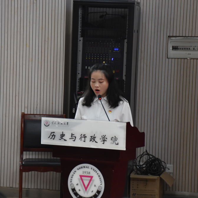 2018级历史学专业王丽洁作为新发展党员代表发言,表示将铭记自己向党和人民许下的郑重承诺,把入党誓词作为自己终身的追求、终身的修养和终身的实践,将以身边的优秀党员为榜样,用党员的标准严格要求自己,将自己的智慧和热血融入到中国特色社会主义建设中去,融入到党和人民的事业中去,用实际行动践行自己今天的誓言,兑现青春的承诺。